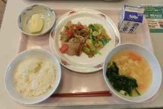 麦ご飯、牛乳、キングポークと卵のオイスター炒め、れんこんのビーンズサラダ、山なすのごまみそ汁、ぶどう(オリンピア)