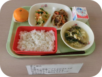 麦ごはん、牛乳、山桜牛と県産パプリカのプルコギ、切干大根とチーズのサラダ、モロヘイヤと卵のとろみスープ、酒寄みかん