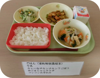 東町特別栽培米ごはん、牛乳、カレーなチキンチキン?ごぼう、金ごまじゃこサラダ、コンコンみぞれ汁