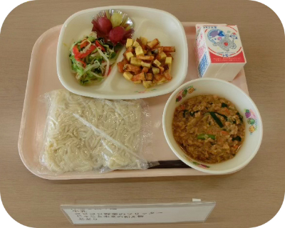 ソフトめん、茨城の恵みたっぷりミートソース、牛乳、しらすとれんこんのジェノベーゼ、県産さつまいも入りフルーツヨーグルト