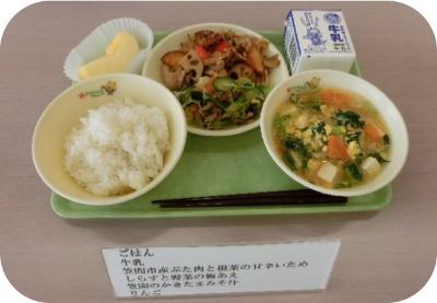 麦ごはん、牛乳、山桜牛と県産パプリカのプルコギ、切干大根とチーズのサラダ、モロヘイヤと卵のとろみスープ、酒寄みかん
