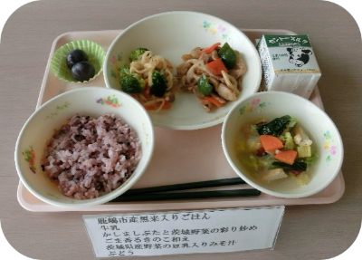 鹿嶋市産黒米入りごはん、牛乳、かしましぶたと茨城野菜の彩り炒め、ごま香るきのこ和え、茨城野菜の豆乳入りみそ汁、ぶどう